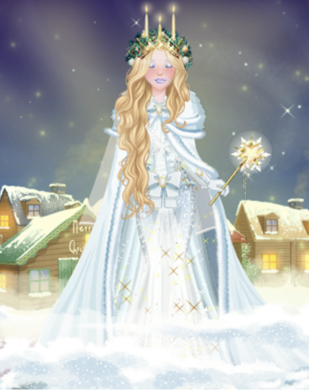 Véritable esprit lumineux de l’hiver, elle apparaît vêtue d’une robe immaculée aux reflets étoilés, symbole de pureté et de douceur.